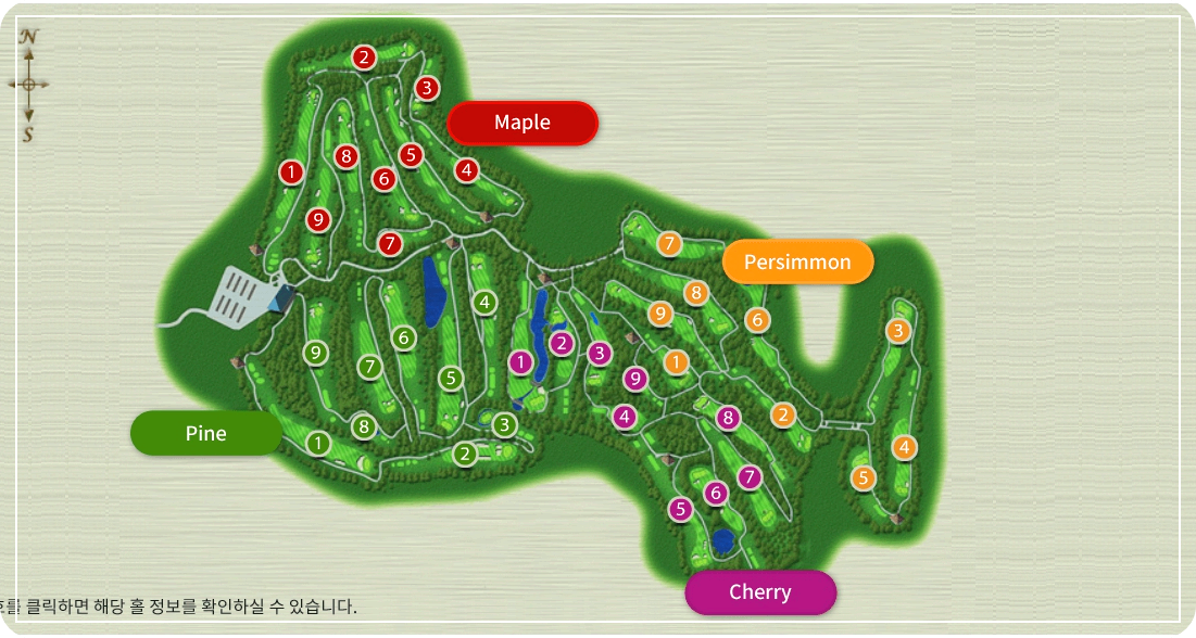 체리(벗나무), 퍼시먼(감나무), 파인(소나무), 메이플(단풍나무) 코스는 차별화된 골프의 묘미를 즐기 실 수 있습니다.