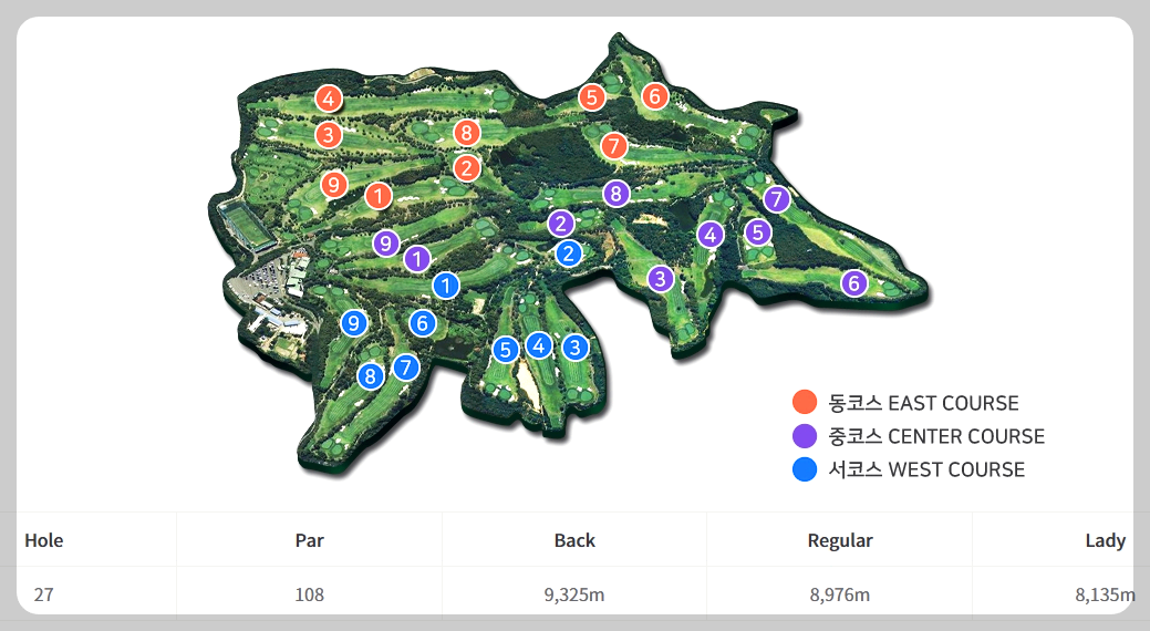 | 홀 수 | 회원제 27홀 (동코스, 중코스, 서코스) |