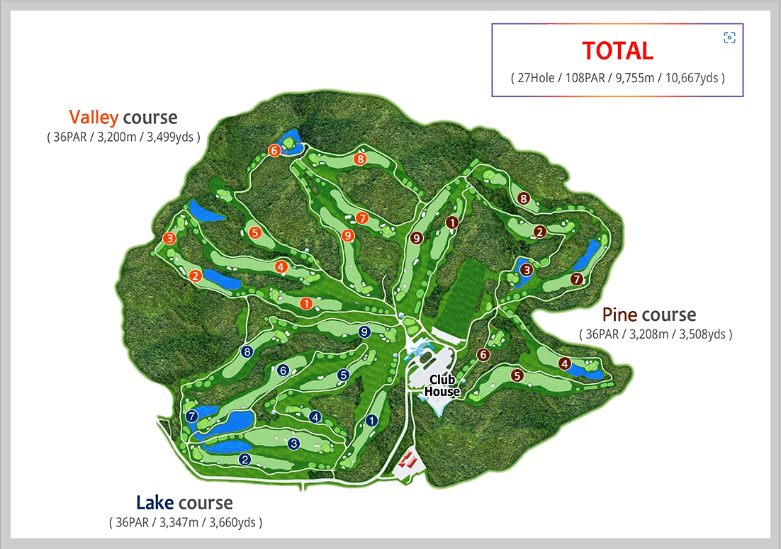 27홀 규모로 레이크코스, 밸리코스, 파인코스 이렇게 3개의 코스로 구성되어 있습니다.