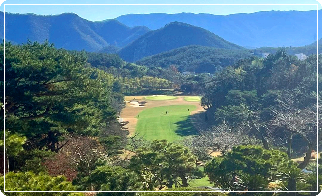 골프장코스는 부산의 웅장한 금정산을 배경으로 멀리 오륜대 호수가 시야에 들어오며
