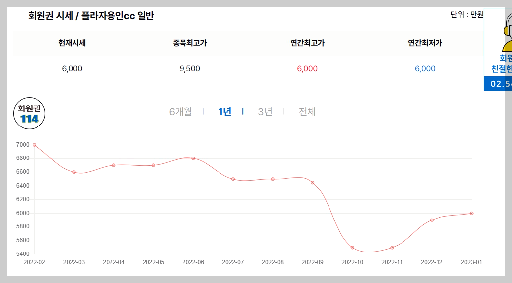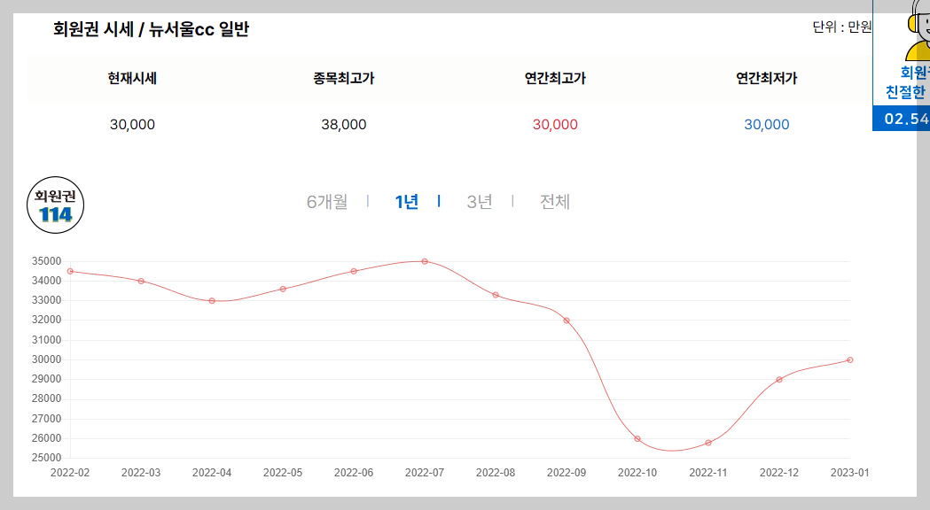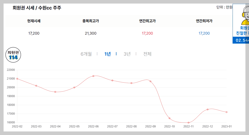 수원CC는 2022년 10월 1억5천5백만원까지 시세가 하락했었습니다.