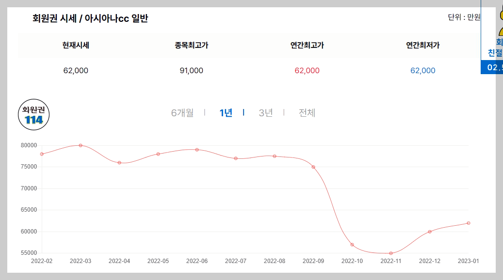 아시아나CC 일반 정회원권가격은 2022년 10월 5억5천만원까지 하락했으나 다시 반등했습니다.