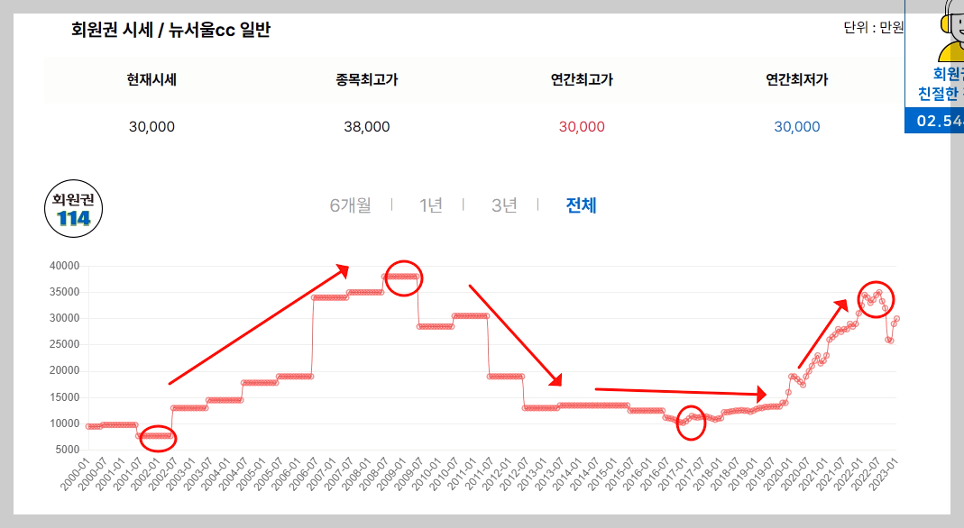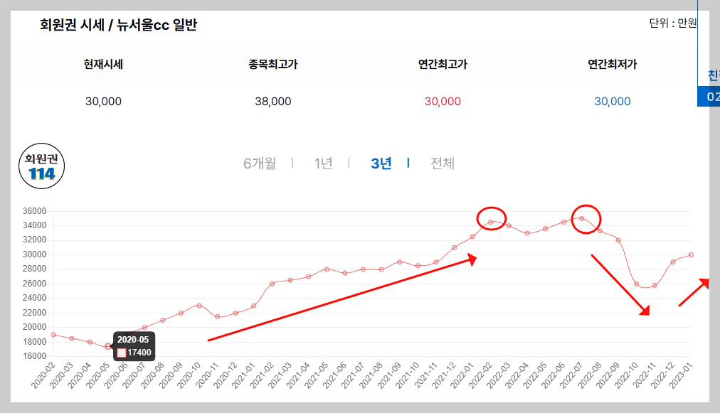 골프회원권시장이 활황이였던 2009년 최고치 3억8천만원까지 상승했었습니다.