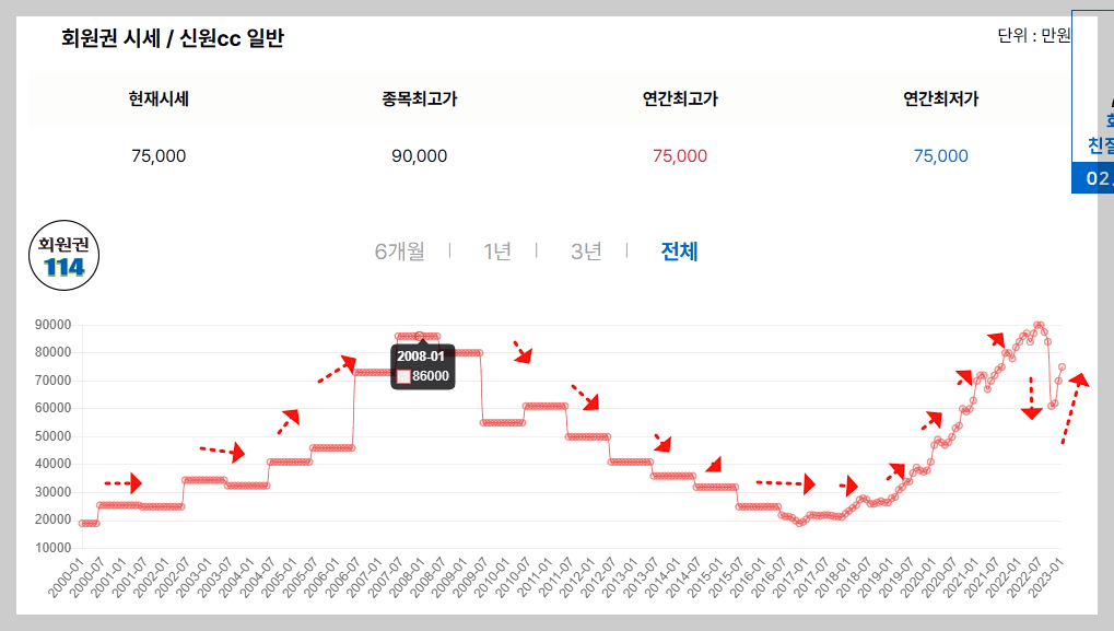 골프회원권가격은 지속적인 상승세를 보이며, 2007년~2008년은 8억6천만원까지 시세가 상승했습니다.