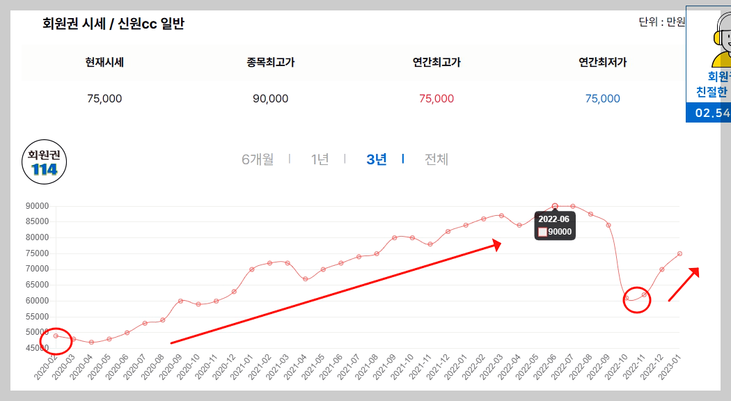 2년 6개월동안 꾸준히 상승했던 신원CC 골프회원권가격은 9억원이 되면서 최고가를 경신합니다.