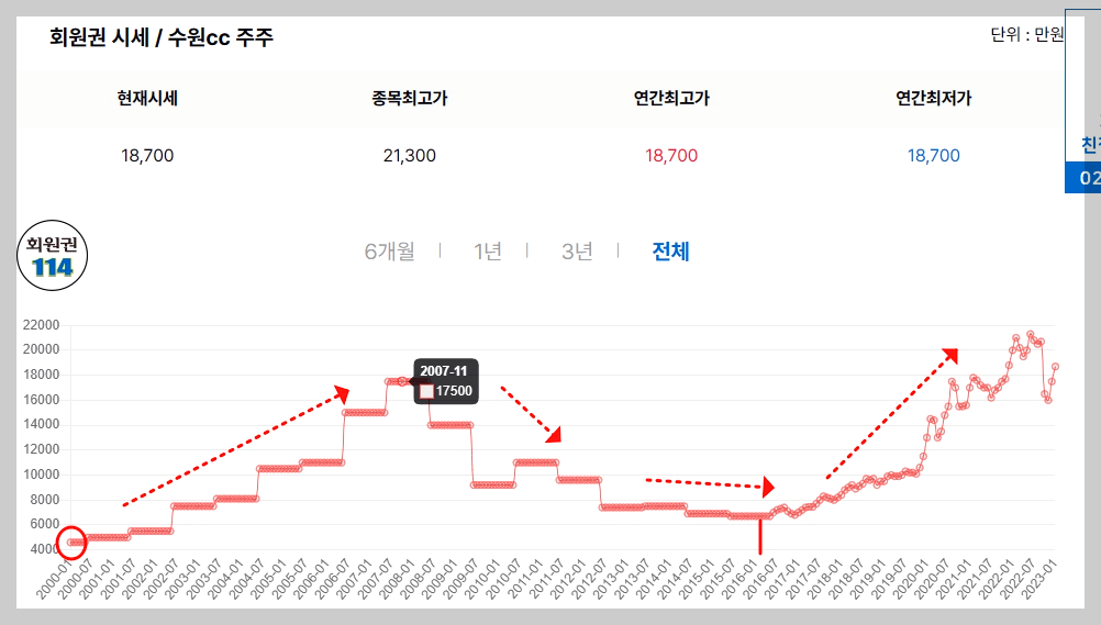 그 이후 시장 침체기동안 수원CC 골프회원권도 하락하면서
