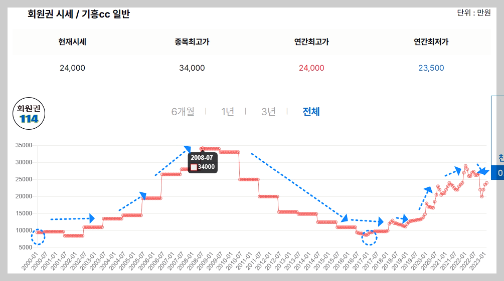 2000년 기흥CC 골프회원권시세는 8800만원~9000만원에 거래가 됐습니다.