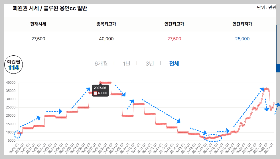 골프회원권 상승시기인 2000년 초반부터 상승세를 보이며 2007년~2008년에는
