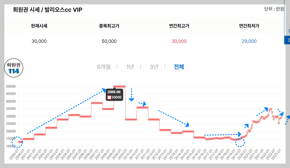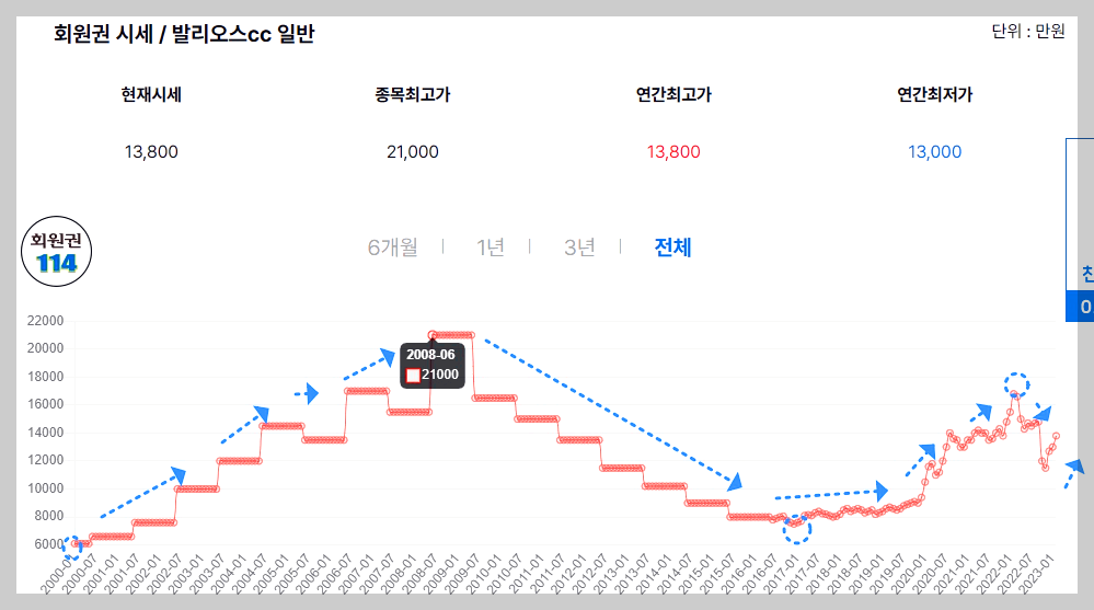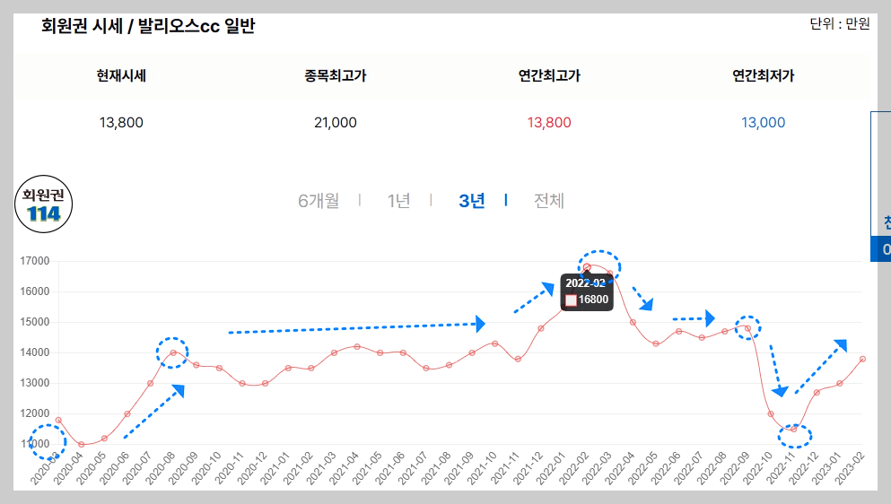 발리오스CC 일반회원권과 우대회원권의 과거부터 최근 시세변동을 확인해보겠습니다.