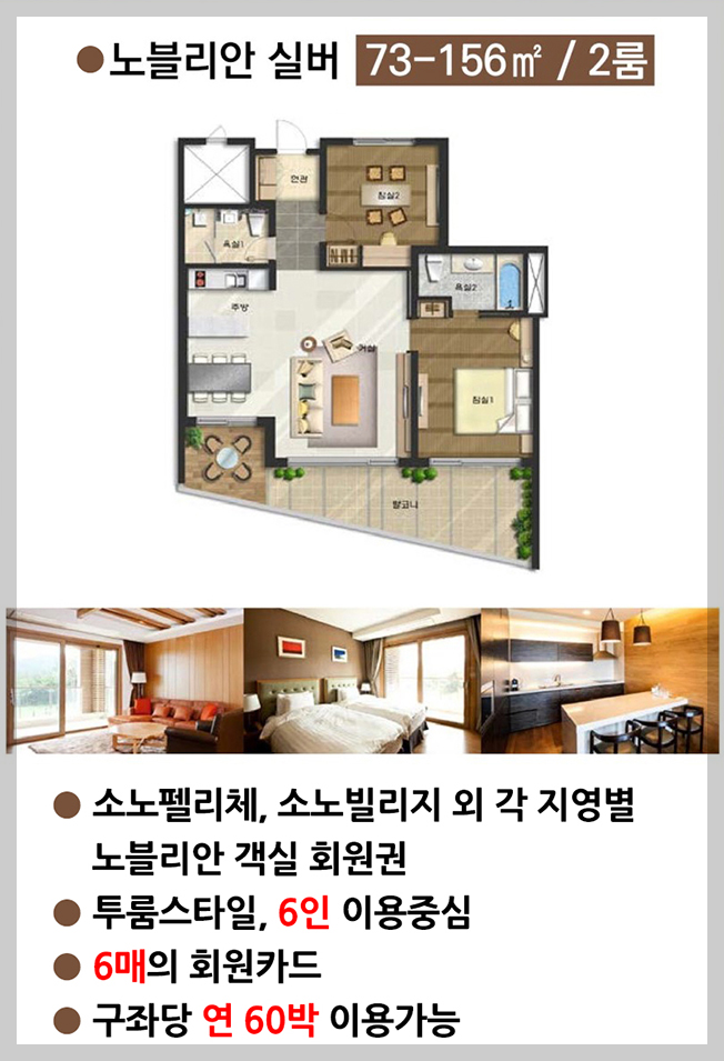 대명노블리안 회원권은 시장에서 실버/ 골드/ 로얄 평형이 주로 거래가 됩니다.