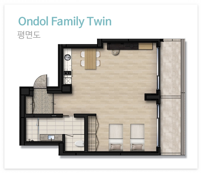 침실2(온돌, 침대) +거실1 + 욕실겸 화장실 2개
