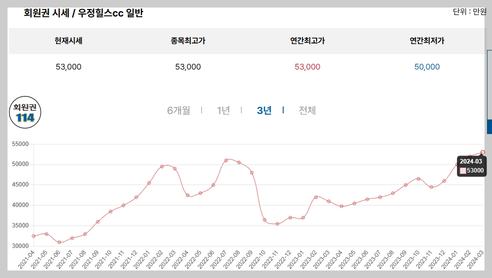 우정힐스cc는 최근 5억3천만원까지 상승된 시세로 형성되어 있습니다.