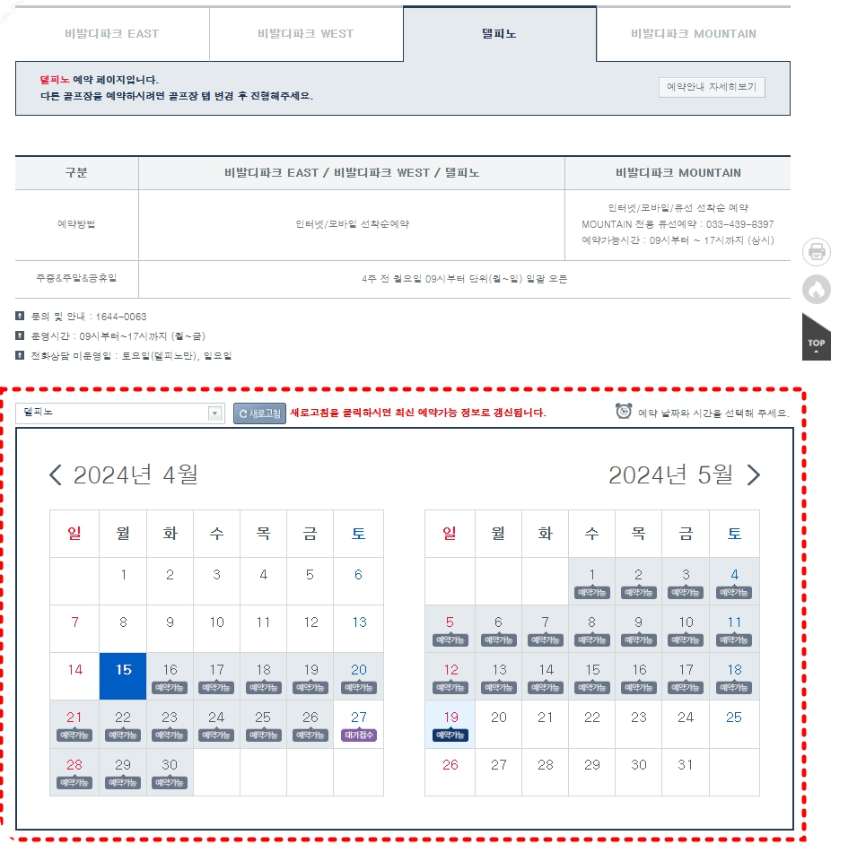 델피노CC를 예약하기 위해 골프장을 클릭하면 위와 같이 예약 캘린더가 나옵니다.