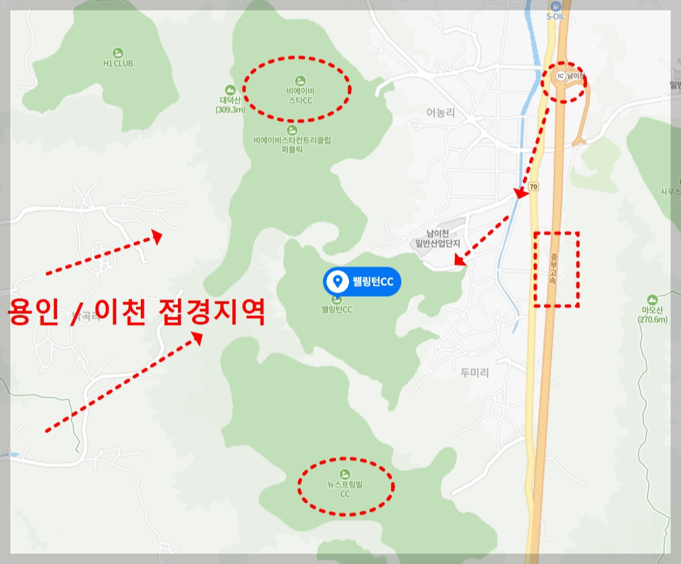 행정구역은 경기도 이천시 이며 용인과 접경지역에 위치합니다. 영동고속도로를 이용하기도 하고 중부고속도로를 이용해서 접근합니다. 주위에는 북쪽으로 비에이비스타CC, 남쪽으로 뉴스프링빌CC가 있습니다. 강남 기준 약 70KM 거리입니다. 접근성이 매우 좋은 편에 속하지 않습니다.