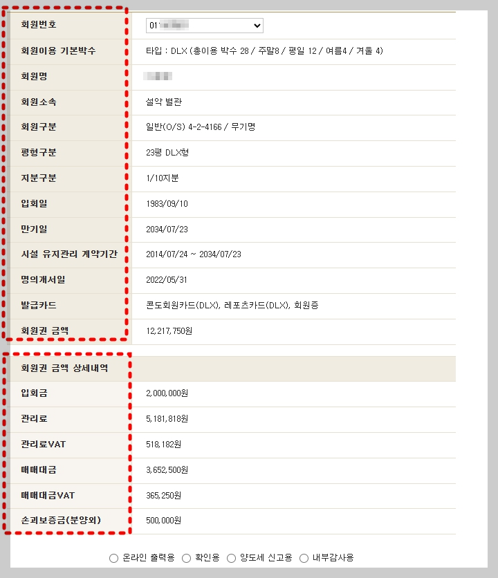 회원권정보에 들어가면 본인이 보유하고 있는 회원권에 관한 자세한 내용이 나옵니다.