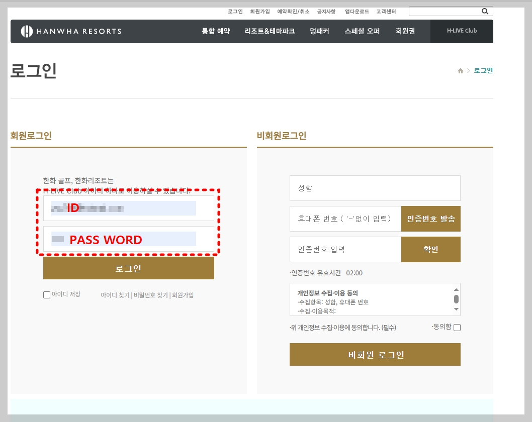 이런분들은 한화리조트 회원관리과에 문의하셔서 ID와 PW를 생성하시기 바랍니다.