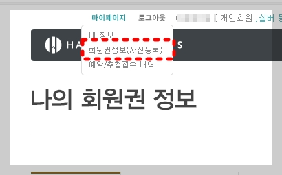 마이페이지에 들어가면 두번째 카테고리에 회원권정보(사진등록) 이 있습니다. 이 항목으로 들어가세요